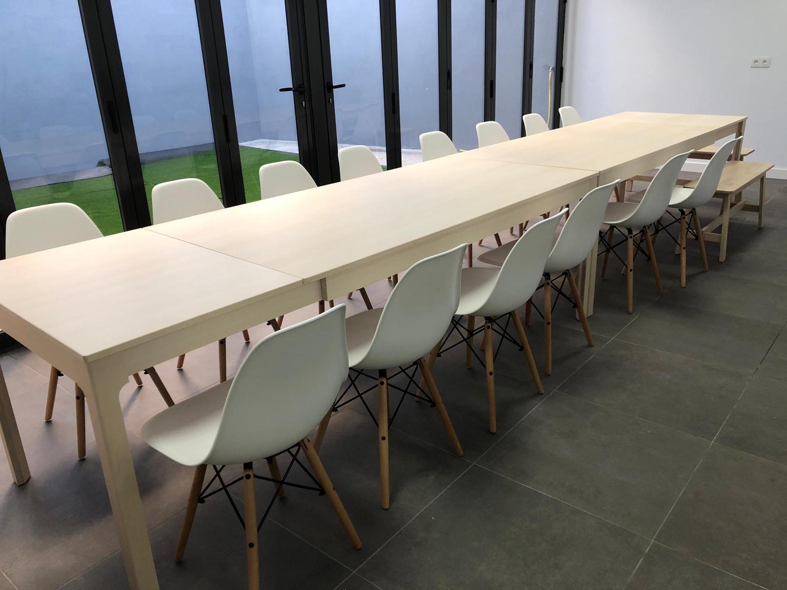 No hay manteles. Para vuestro interés las dimensiones de las mesas son de 240 x 90 cm y de 180 x 75 cm.